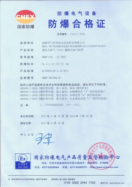产品名称: LNG撬装式加气装置防爆合格证 |